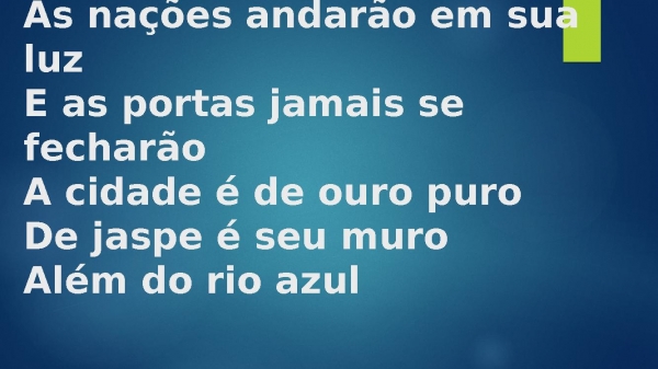 - As nações andarão em sua luzE as portas jamais se fecharãoA cidade é de ouro puroDe jaspe é seu muroAlém do rio azul
