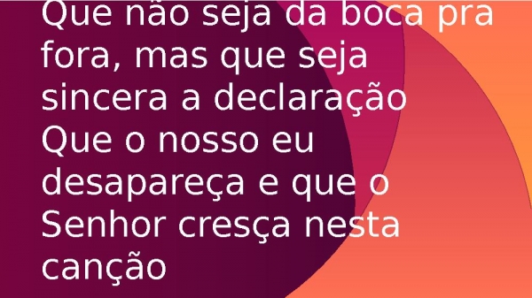 - Que não seja da boca pra fora, mas que seja sincera a declaraçãoQue o nosso eu desapareça e que o Senhor cresça nesta canção