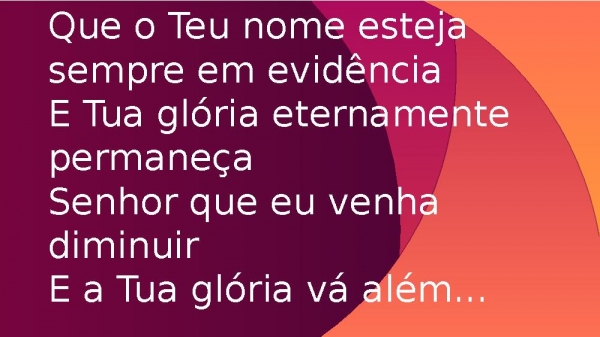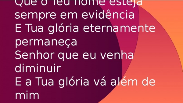 - Que o Teu nome esteja sempre em evidênciaE Tua glória eternamente permaneçaSenhor que eu venha diminuirE a Tua glória vá além de mim