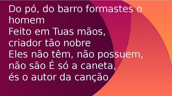 - Do pó, do barro formastes o homemFeito em Tuas mãos, criador tão nobreEles não têm, não possuem,não são É só a caneta, és o autor da canção