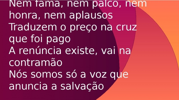- Nem fama, nem palco, nem honra, nem aplausosTraduzem o preço na cruz que foi pagoA renúncia existe, vai na contramãoNós somos só a voz que anuncia a salvação