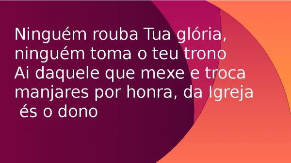 - Ninguém rouba Tua glória, ninguém toma o teu tronoAi daquele que mexe e troca manjares por honra, da Igreja és o dono