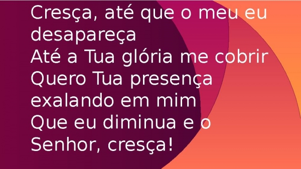 - Cresça, até que o meu eu desapareçaAté a Tua glória me cobrirQuero Tua presença exalando em mimQue eu diminua e o Senhor, cresça!