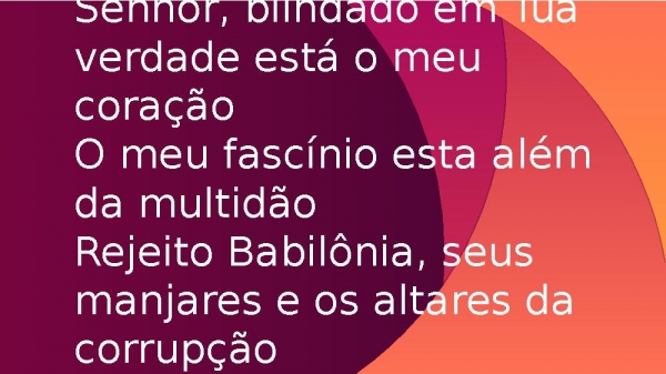 - Senhor, blindado em Tua verdade está o meu coraçãoO meu fascínio esta além da multidãoRejeito Babilônia, seus manjares e os altares da corrupção