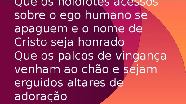 - Que os holofotes acessos sobre o ego humano se apaguem e o nome de Cristo seja honradoQue os palcos de vingança venham ao chão e sejam erguidos altares de adoração