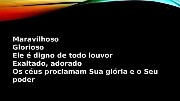 - 2MaravilhosoGloriosoEle é digno de todo louvorExaltado, adoradoOs céus proclamam Sua glória e o Seu poder