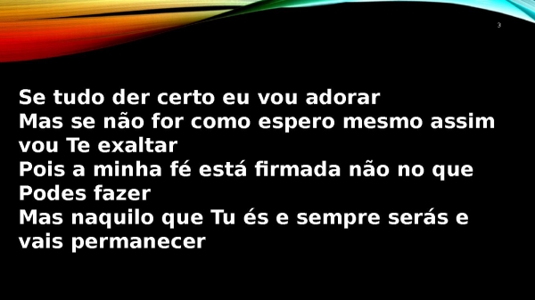 - 3Se tudo der certo eu vou adorarMas se não for como espero mesmo assim vou Te exaltarPois a minha fé está firmada não no que Podes fazerMas naquilo que Tu és e sempre serás e vais permanecer