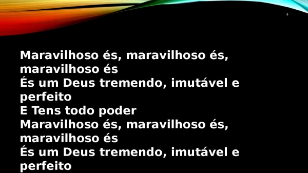 - 4Maravilhoso és, maravilhoso és, maravilhoso ésÉs um Deus tremendo, imutável e perfeitoE Tens todo poderMaravilhoso és, maravilhoso és, maravilhoso ésÉs um Deus tremendo, imutável e perfeitoE Tens todo poder