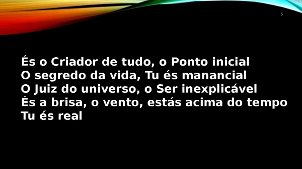 - 5És o Criador de tudo, o Ponto inicialO segredo da vida, Tu és manancialO Juiz do universo, o Ser inexplicávelÉs a brisa, o vento, estás acima do tempoTu és real