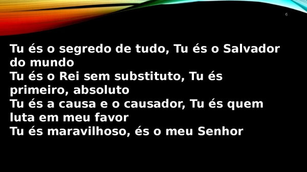 - 6Tu és o segredo de tudo, Tu és o Salvador do mundoTu és o Rei sem substituto, Tu és primeiro, absolutoTu és a causa e o causador, Tu és quem luta em meu favorTu és maravilhoso, és o meu Senhor