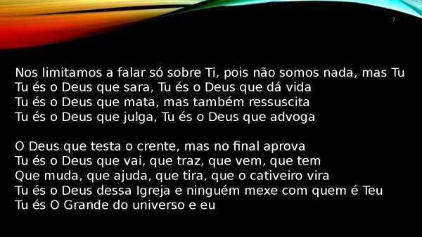 - 7Nos limitamos a falar só sobre Ti, pois não somos nada, mas TuTu és o Deus que sara, Tu és o Deus que dá vidaTu és o Deus que mata, mas também ressuscitaTu és o Deus que julga, Tu és o Deus que advogaO Deus que testa o crente, mas no final aprovaTu és o Deus que vai, que traz, que vem, que temQue muda, que ajuda, que tira, que o cativeiro viraTu és o Deus dessa Igreja e ninguém mexe com quem é TeuTu és O Grande do universo e eu