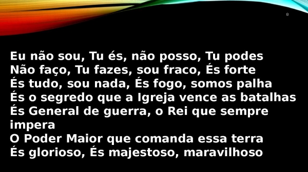 - 8Eu não sou, Tu és, não posso, Tu podesNão faço, Tu fazes, sou fraco, És forteÉs tudo, sou nada, És fogo, somos palhaÉs o segredo que a Igreja vence as batalhasÉs General de guerra, o Rei que sempre imperaO Poder Maior que comanda essa terraÉs glorioso, És majestoso, maravilhoso