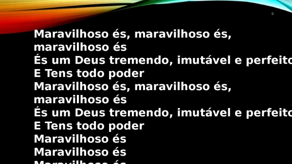 - 9Maravilhoso és, maravilhoso és, maravilhoso ésÉs um Deus tremendo, imutável e perfeitoE Tens todo poderMaravilhoso és, maravilhoso és, maravilhoso ésÉs um Deus tremendo, imutável e perfeitoE Tens todo poderMaravilhoso ésMaravilhoso ésMaravilhoso ésMaravilhoso és