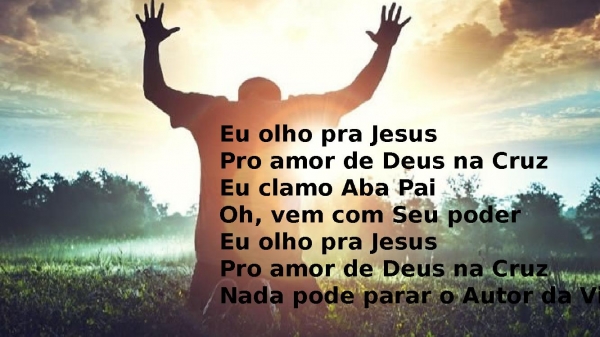 - Eu olho pra JesusPro amor de Deus na CruzEu clamo Aba PaiOh, vem com Seu poderEu olho pra JesusPro amor de Deus na CruzNada pode parar o Autor da Vida