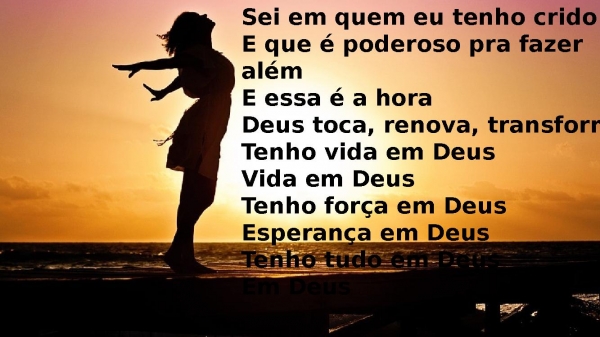 - Sei em quem eu tenho cridoE que é poderoso pra fazer alémE essa é a horaDeus toca, renova, transformaTenho vida em DeusVida em DeusTenho força em DeusEsperança em DeusTenho tudo em DeusEm Deus