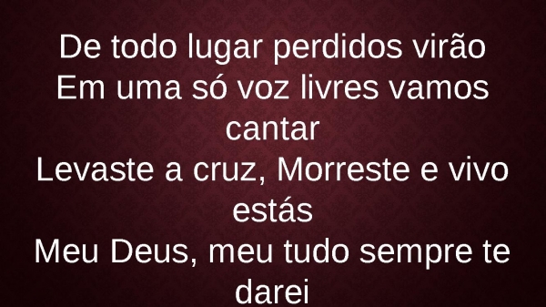 - De todo lugar perdidos virãoEm uma só voz livres vamos cantarLevaste a cruz, Morreste e vivo estásMeu Deus, meu tudo sempre te darei