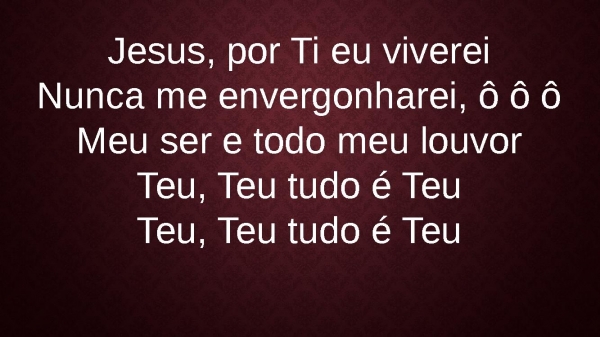 - Jesus, por ti eu vivereiNunca me envergonharei, ô ô ôMeu ser e todo meu louvorTeu, Teu tudo é TeuTeu, Teu tudo é Teu