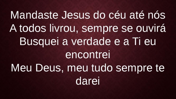 - Mandaste Jesus do céu até nósA todos livrou, sempre se ouviráBusquei a verdade e a Ti eu encontreiMeu Deus, meu tudo sempre te darei
