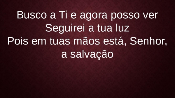 - Busco a Ti e agora posso verSeguirei a tua luzPois em tuas mãos está, Senhor, a salvação