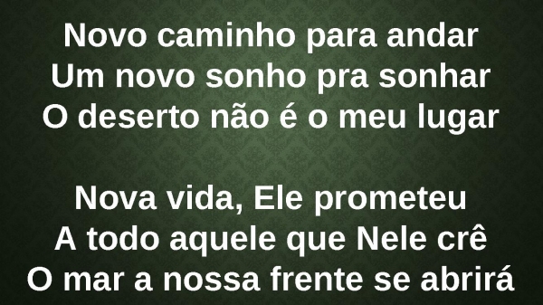 - Novo caminho para andarUm novo sonho pra sonharO deserto não é o meu lugarNova vida, Ele prometeuA todo aquele que Nele crêO mar a nossa frente se abrirá