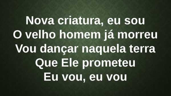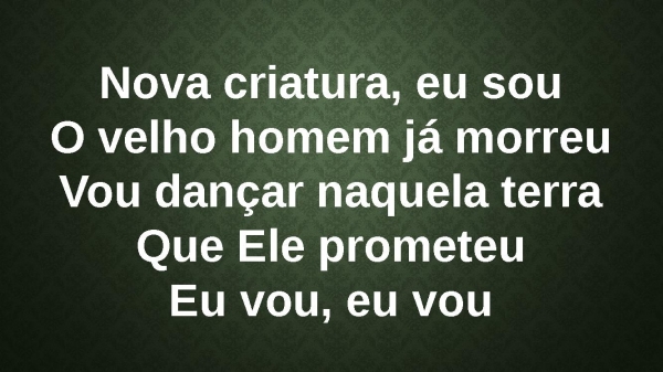 - Nova criatura, eu souO velho homem já morreuVou dançar naquela terraQue Ele prometeuEu vou, eu vou