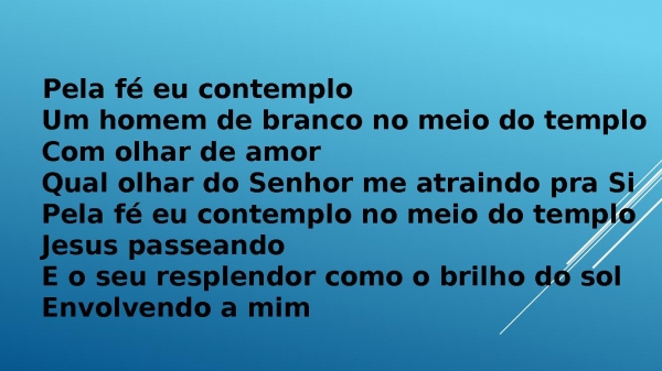 - Pela fé eu contemplo Um homem de branco no meio do templo Com olhar de amor Qual olhar do Senhor me atraindo pra Si Pela fé eu contemplo no meio do templo Jesus passeando E o seu resplendor como o brilho do sol Envolvendo a mim