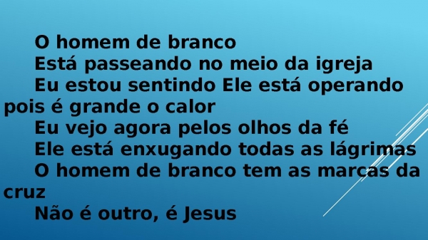 - O homem de branco Está passeando no meio da igreja Eu estou sentindo Ele está operando pois é grande o calor Eu vejo agora pelos olhos da fé Ele está enxugando todas as lágrimas O homem de branco tem as marcas da cruz Não é outro, é Jesus