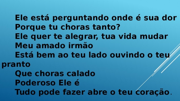 - Ele está perguntando onde é sua dor Porque tu choras tanto? Ele quer te alegrar, tua vida mudar Meu amado irmão Está bem ao teu lado ouvindo o teu pranto Que choras calado Poderoso Ele é Tudo pode fazer abre o teu coração.