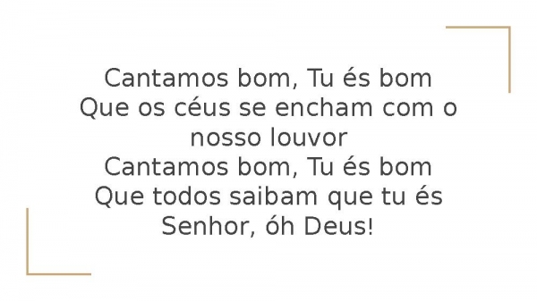 - Cantamos bom, Tu és bomQue os céus se encham com o nosso louvorCantamos bom, Tu és bomQue todos saibam que tu és Senhor