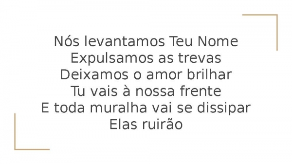 - Nós levantamos Teu NomeExpulsamos as trevasDeixamos o amor brilharTu vais à nossa frenteE toda muralha vai se dissiparElas ruirão