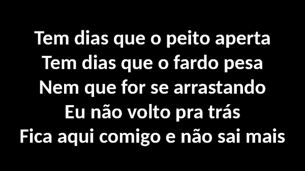 - Tem dias que o peito apertaTem dias que o fardo pesaNem que for se arrastandoEu não volto pra trásFica aqui comigo e não sai mais
