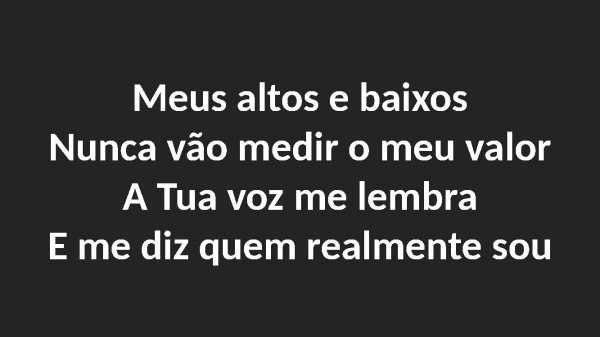 - Meus altos e baixosNunca vão medir o meu valorA Tua voz me lembraE me diz quem realmente sou