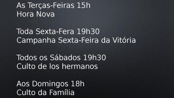 - As Terças-Feiras 15hHora Nova Toda Sexta-Fera 19h30Campanha Sexta-Feira da Vitória Todos os Sábados 19h30Culto de los hermanos Aos Domingos 18hCulto da Família