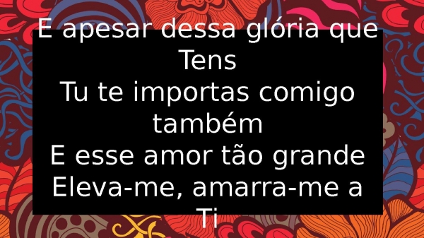 - E apesar dessa glória que TensTu te importas comigo tambémE esse amor tão grandeEleva-me, amarra-me a Ti