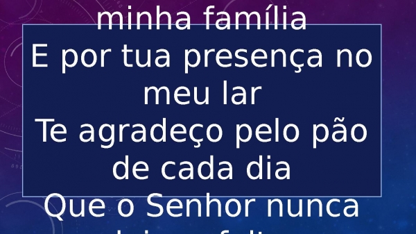 - Te agradeço pela minha famíliaE por tua presença no meu larTe agradeço pelo pão de cada diaQue o Senhor nunca deixou faltar