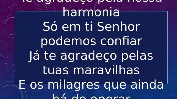 - Te agradeço pela nossa harmoniaSó em ti Senhor podemos confiarJá te agradeço pelas tuas maravilhasE os milagres que ainda há de operar