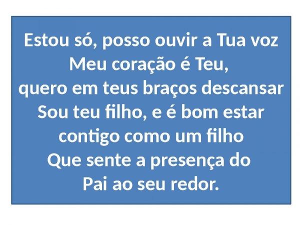 - Estou só, posso ouvir a Tua vozMeu coração é Teu, quero em teus braços descansarSou teu filho, e é bom estar contigo como um filhoQue sente a presença do Pai ao seu redor.