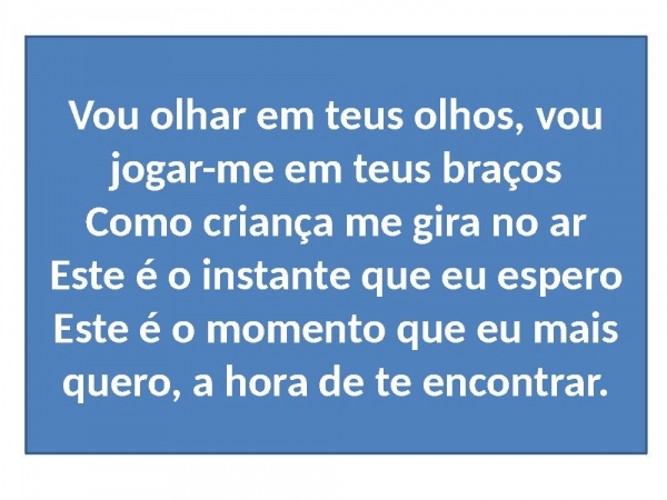 - Vou olhar em teus olhos, vou jogar-me em teus braçosComo criança me gira no arEste é o instante que eu esperoEste é o momento que eu mais quero, a hora de te encontrar.