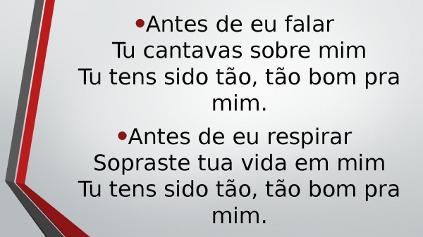 - Antes de eu falarTu cantavas sobre mimTu tens sido tão, tão bom pra mim.Antes de eu respirarSopraste tua vida em mimTu tens sido tão, tão bom pra mim.