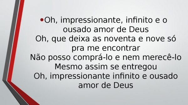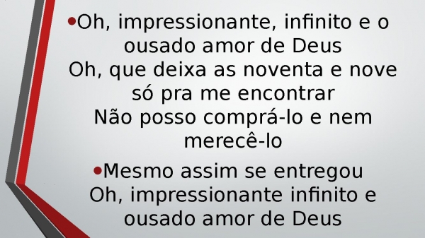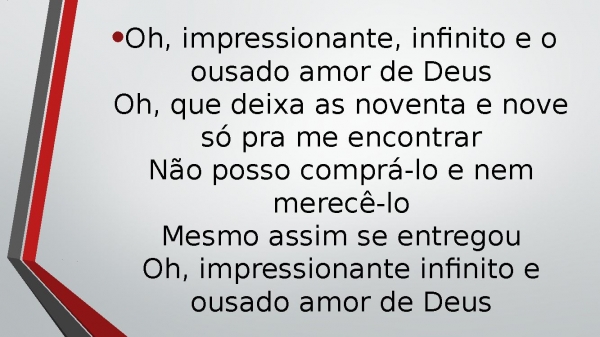 - Oh, impressionante, infinito e o ousado amor de DeusOh, que deixa as noventa e nove só pra me encontrarNão posso comprá-lo e nem merecê-loMesmo assim se entregouOh, impressionante infinito e ousado amor de Deus