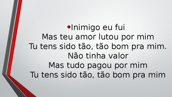 - Inimigo eu fuiMas teu amor lutou por mimTu tens sido tão, tão bom pra mim.Não tinha valorMas tudo pagou por mimTu tens sido tão, tão bom pra mim