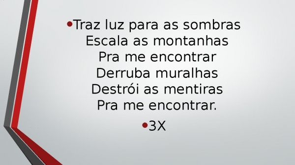 - Traz luz para as sombrasEscala as montanhasPra me encontrarDerruba muralhasDestrói as mentirasPra me encontrar.3X