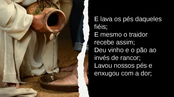 - E lava os pés daqueles fiéis;E mesmo o traidor recebe assim;Deu vinho e o pão ao invés de rancor;Lavou nossos pés e enxugou com a dor;