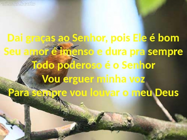 - Dai graças ao Senhor, pois Ele é bomSeu amor é imenso e dura pra sempreTodo poderoso é o SenhorVou erguer minha vozPara sempre vou louvar o meu Deus