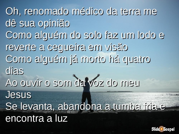 - Oh, renomado médico da terra me dê sua opiniãoComo alguém do solo faz um lodo e reverte a cegueira em visãoComo alguém já morto há quatro diasAo ouvir o som da voz do meu JesusSe levanta, abandona a tumba fria e encontra a luz
