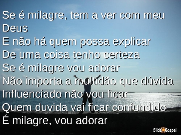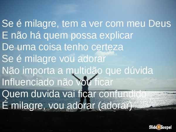 - Se é milagre, tem a ver com meu DeusE não há quem possa explicarDe uma coisa tenho certezaSe é milagre vou adorarNão importa a multidão que dúvidaInfluenciado não vou ficarQuem duvida vai ficar confundidoÉ milagre, vou adorar (adorar)