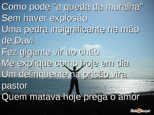 - Como pode "a queda da muralha"Sem haver explosãoUma pedra insignificante na mão de DaviFez gigante vir ao chãoMe explique como hoje em diaUm delinquente na prisão vira pastorQuem matava hoje prega o amor