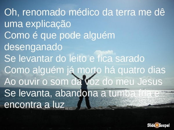 - Oh, renomado médico da terra me dê uma explicaçãoComo é que pode alguém desenganadoSe levantar do leito e fica saradoComo alguém já morto há quatro diasAo ouvir o som da voz do meu JesusSe levanta, abandona a tumba fria e encontra a luz