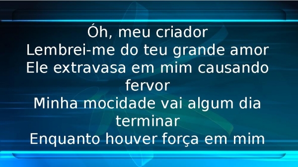 - Óh, meu criadorLembrei-me do teu grande amorEle extravasa em mim causando fervorMinha mocidade vai algum dia terminarEnquanto houver força em mim