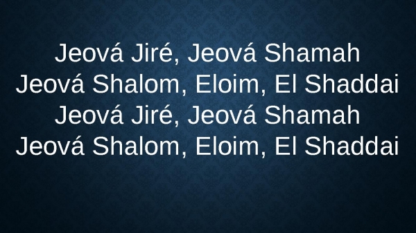 - Jeová Jiré, Jeová ShamahJeová Shalom, Eloim, El ShaddaiJeová Jiré, Jeová ShamahJeová Shalom, Eloim, El Shaddai